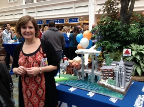 Lori Lynah, Director of Marketing & Air Service Development at the Savannah/Hilton Head International Airport, stands in front of an incredible cake designed by a local baker to celebrate JetBlue’s inaugural Savannah flight.