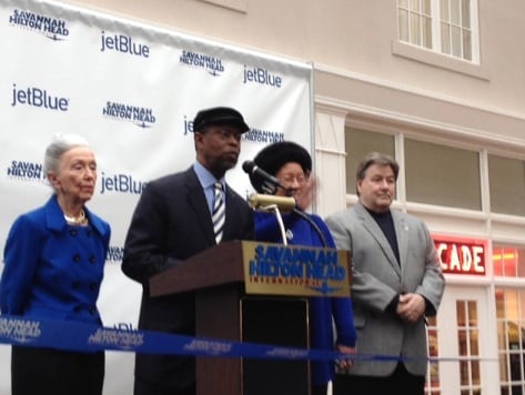 Our client, the Savannah/Hilton Head International Airport, had lots of reasons to celebrate this morning as the inaugural JetBlue flight landed in Savannah from New York. Savannah government, tourism and airport officials were traveled to New York earlier this week despite wintry conditions for a grand celebration of the partnership between the airport and its newest airline. When they arrived in Savannah this morning on JetBlue’s "Pretty In Blue" airplane, they were welcomed aptly by a crowd of media members, officials, spectators and more. Mayor Edna Jackson even handed out Savannah-made macaroons to each passenger on the inaugural flight! Our own Lisa Markowitz-Kitchens was on-hand at the airport this morning to welcome everyone and snapped some shots from the ceremony. JetBlue will offer several non-stop flights to and from Savannah at a very low rate. We are so excited for this incredible milestone both for our client and for Savannah!
