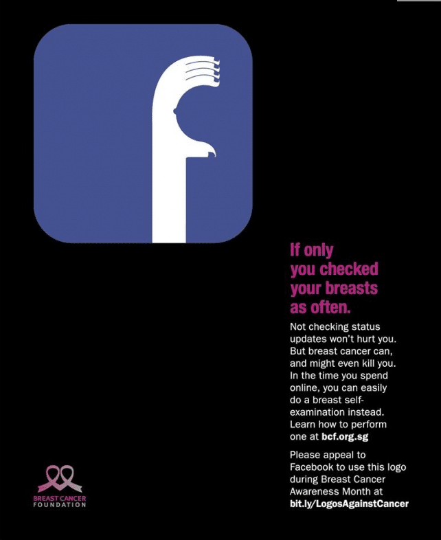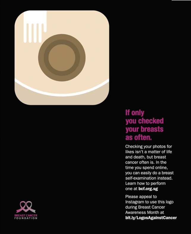 DDB Singapore released a series of ads for the Breast Cancer Foundation that is perfectly timed with Breast Cancer Awareness Month. These ads feature the familiar logos of our favorite social networks, Facebook, Twitter and Instagram. However, the logos are “tweaked” to resemble and promote self-breast exams. The ads also point to an online petition urging the social media giants to actually change their logos temporarily for the cause. The main tagline in these ads is, “If only you checked your breasts as often.”