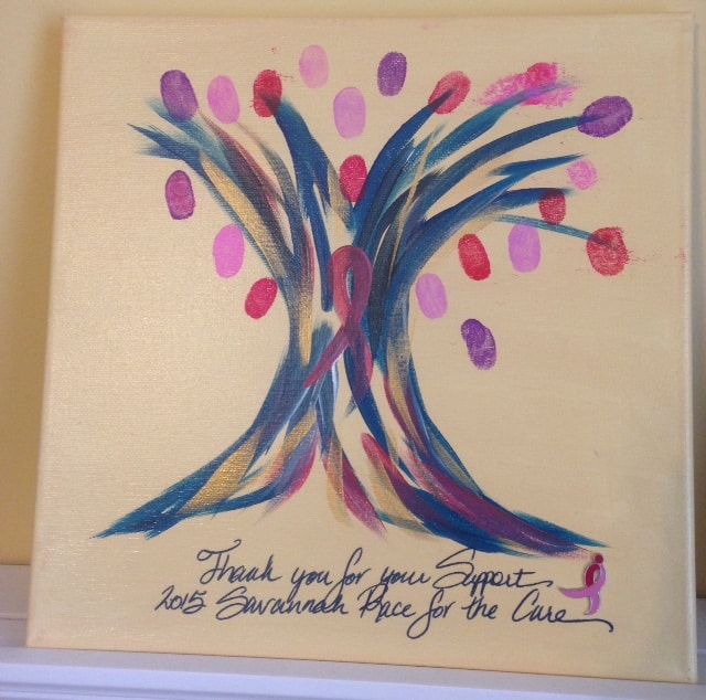 Painted by Ginger Wilkins of GingerSnaps Art, each thumbprint is of a breast cancer survivor that participated in the Race For the Cure in April. So cool! Thank you for this wonderful gift, and we are already looking forward to next year’s race!